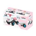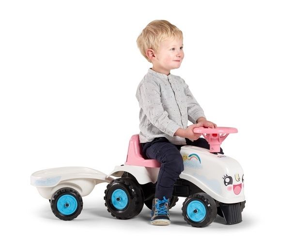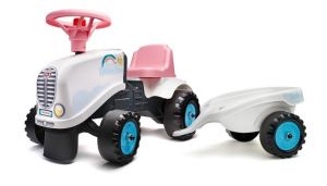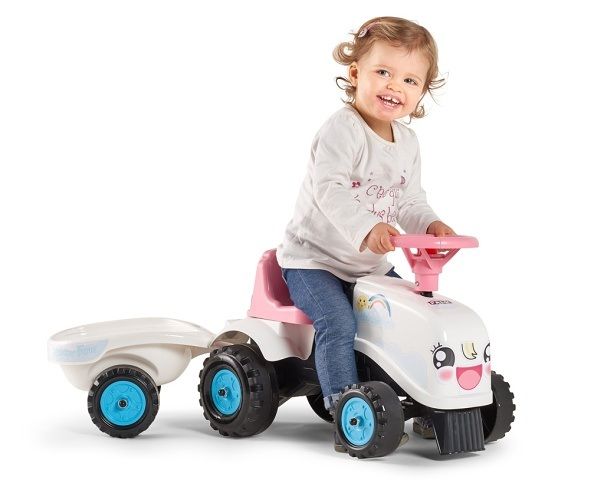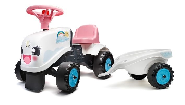 Odstrkovadlo – traktor Rainbow bílo/růžové s volantem a valníkem. V balení jsou dvě sady samolepek na přední masku, můžete si vybrat polepky dle vlastní nálady. Vyrobeno ve Francii z vysoce oddoleného a kvalitního plastu. Testováno dle evropských norem na hnotnost 30 kg. Rozměry odrážedla 91×34×37 cm.