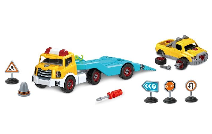 Odtahovka šroubovací. Velikost 37cm. obsahuje: šroubovací odtahovku a šroubovací auto s navijákem, šroubovák, dopravní značky.