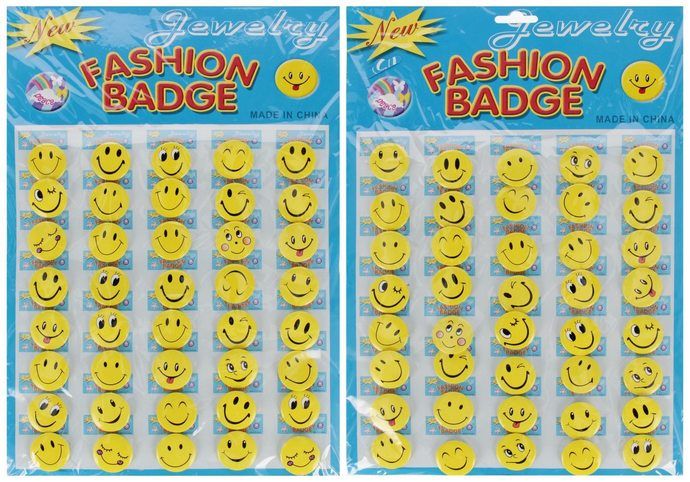 Kulatý odznak v podobě veselého smajlíka, velikost 3cm. Balení obsahuje 40ks odznaků.
