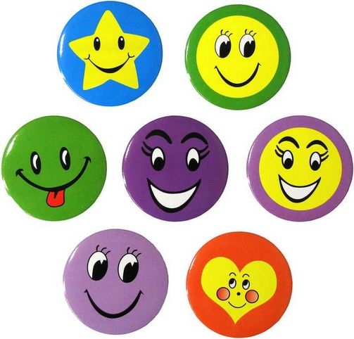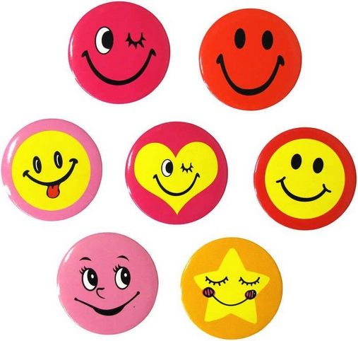 Velká barevná placka (button) - velký kulatý odznak v podobě veselého smajlíka, v různých variantách provedení.
