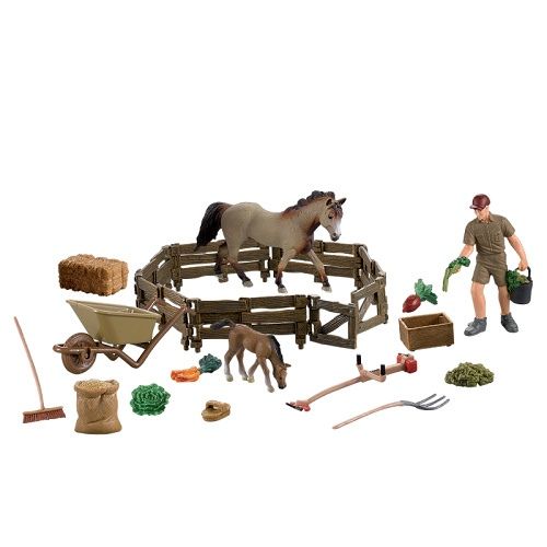 Ohrada s klisnou a hříbětem. Sada obsahuje jednu klisnu, jedno hříbě v šedém zbarvení, postavičku farmáře a v neposlední řadě také mnoho skvělého příslušenství. Skvělá zábava pro malé nadšence do farmaření. Tato hračka je součástí kolekce Moje malá farma.