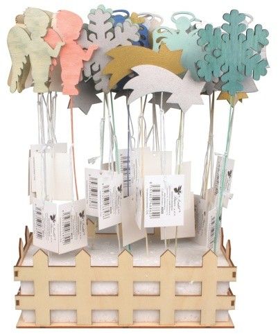 Dřevěná ohrádka s vánočními dekoracemi Dekorace na drátku využijete k různým dekoračním či aranžérským účelům. Ohrádka obsahuje 24 kusů dekorací v mixu motivů. Naleznete zde například vločky, andílky nebo třeba hvězdičky. Vhodné do obchodů jako doplňkový prodej k pokladně.