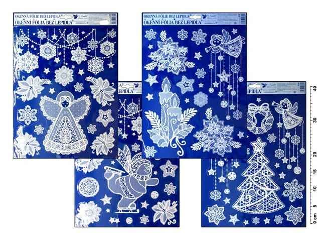 Okenní fólie - krajková - vločky, andílci, sněhulák, strom, hvězdy - Vyzdobte si okno krásnými samolepkami. Navodí příjemnou atmosféru Vánoc. Obrázky vypadají, jako by byly vyrobeny z krajky. NÁVOD: 1. Sloupněte obrázek z podložky a umístěte na čisté, případně navlhčené sklo stranou, která byla na podložce. 2. Obrázek elektrostaticky přilne. Uvedená cena je za 1 ks.