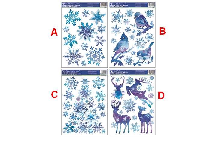 Okenní folie ptáčci s vločkami a stromek z vloček modrý s glitry 37x29cm 4 druhy