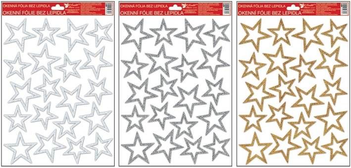 Okenní fólie s glitry stříbrné,zlaté,bílé hvězdy 33,5x26 cm