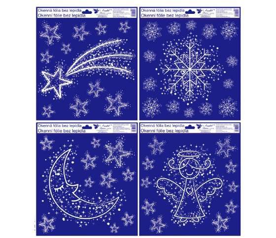 Dekorační okenní fólie- elektrostatická - neobsahuje lepidlo- nezanechává žádnou stopu- vhodná na haldké povrchy (sklo, výloha, zrcadlo, kachličky)- mix motivů- rozměr archu: 30 x 33,5cm
