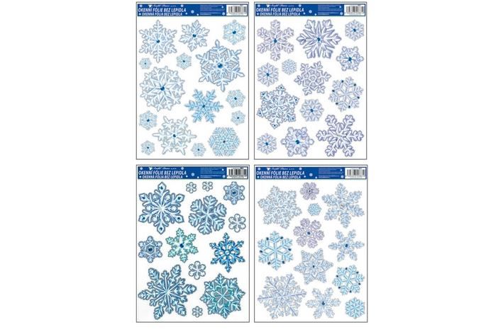 Okenní folie vločky krystaly se stříbrnými glitry 38x30cm.