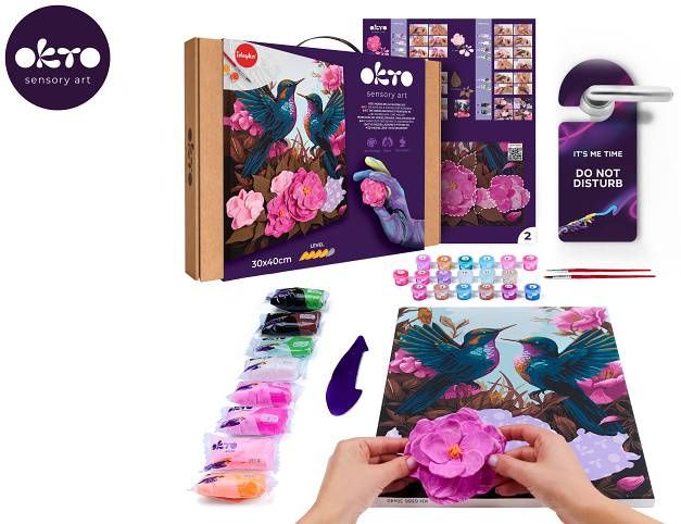 OKTO Malba a 3D modelování obraz "Hummingbirds in Love". Velikost plátna 30x40 cm. Vymalujte obrázek podle čísel a vytvarujte 3D prvek obrazu. Obtížnost 4/5. Obsah balení - plátno, obrázkový návod, modelovací nástroj, Sada samoschnoucí modelovací hmoty, set barev na malování, štětec.