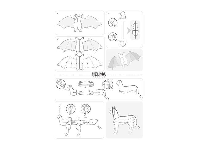 Oiginální papírová 3D skládačka k vymalování dle vlastních představ bez použití nůžek, nebo lepidla 3D omalovánky Helma Models vhodné pro děti od 4 let Balení o velikosti A5 se zvířaty: 2ks – netopýr a kočička.
