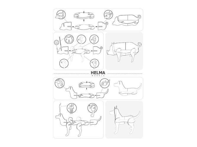 Oiginální papírová 3D skládačka k vymalování dle vlastních představ bez použití nůžek, nebo lepidla 3D omalovánky Helma Models vhodné pro děti od 4 let Balení o velikosti A5 se zvířaty: 2ks – prasátko a pejsek.