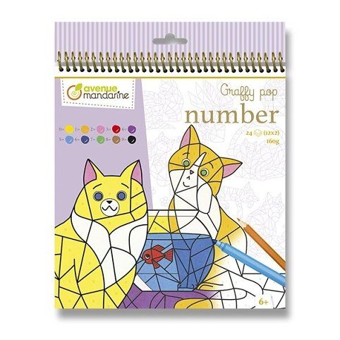 Omalovánky Avenue Mandarine Graffy Pop Number s motivy kočiček určené k vybarvení pomocí čísel. Každá jednotlivá barva je spojena s daným číslem od 0 do 9. Ideální pro procvičování jemné motoriky a učení barev. Omalovánky obsahují 24 listů, 12 motivů po 2 ks. Gramáž 160 g. Vhodné pro děti od 6 let,,Rozměry balení: 20 x 25,5 cm.