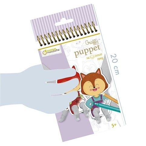 Omalovánky Avenue Mandarine Graffy Puppet s různými motivy obrázků vyjadřujících emoce. Omalovánky předem připravené a upravené pro následné použití jako prstové loutky, stačí je vybarvit a hrát si. Omalovánky obsahují 24 listů, 12 motivů po 2 ks, kroužková vazba. Lze použít na techniky: pastelky, fixy, akvarel atd. Gramáž 250 g. Vhodné pro děti již od 5 let,,Rozměry 10 x 20 cm