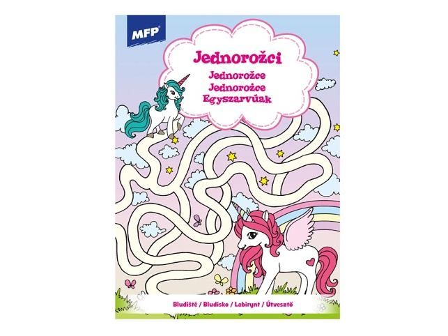 Bludiště - Jednorožci. Udělejte si pohodové odpoledne s dětmi a najdete cestu bludičtěm. Děti se zabaví a navíc potrápí své mozkové závity. Na poslední stránce jsou řešení všech bludiští. Bludiště jsou jednodichá, tudíž vhodné i pro ty nejmenší děti. Formát: A4 Papír: 80g Počet předloh: 32 Desky omalovánek: 280g papíru s laminem Počet stran: 32 Varování: Nevhodné pro děti do 3 let. Nebezpečí vdechnutí a spolknutí malých částic.