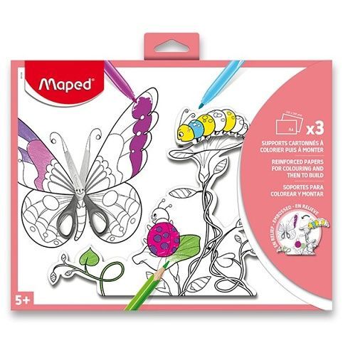 Omalovánky Maped s 3D elementy. Součástí je bloček s lepicími polštářky, díky kterým samostatné elementy připevníte k předloze a díky tomu získáte zajímavý 3D efekt. Obrázek ožije a stane se zajímavou dekorací dětského pokoje. Vhodný pro vybarvování běžnými pastelkami či fixami. Dostupné ve dvou variantách, 3 rozdílné ilustrace. Formát A4. Papír 350 g/m2. Vhodné pro děti od 5 let.