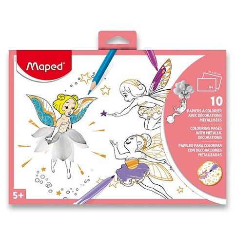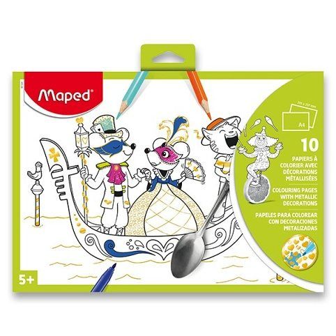 Omalovánky Maped s 10 různými předlohami s metalickým efektem. Výsledný obrázek rozzáří natištěné dekorace ve zlatém, stříbrném nebo bronzovém tónu. Vhodné pro vybarvování běžnými pastelkami či fixami.Dostupné ve dvou variantách. 10 stránek / 10 různých motivů. Formát A4, papír 200 g/m2. Mix 2 motivů. Vhodné pro děti od 5 let.