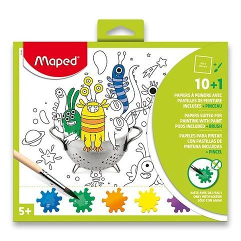 Praktické omalovánky Maped se štětcem a paletou vybraných barev u každé předlohy. Dostupné ve dvou variantách. 10 stránek / 10 různých motivů. Formát 200 x 240 mm. Papír 300 g/m2. Mix 2 motivů. Součástí balení je štětec a barvy. Barvy je možné od každé předlohy lehce oddělit. Vhodné pro děti od 5 let.
