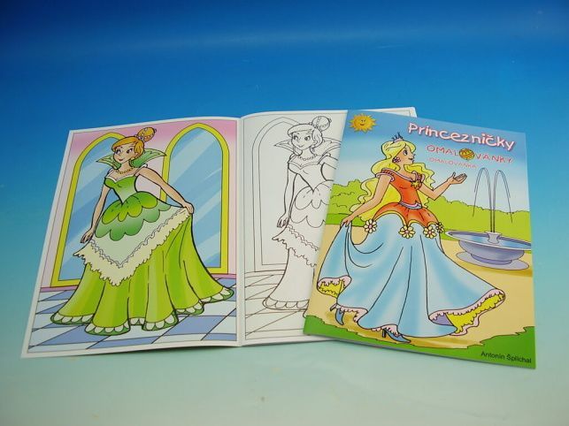 Dětské omalovánky Princezničky formát A4 obsahuje 8 barevných předloh a 8 stran určených k vybarvení, součástí je minipexeso, doplňovačka a záložka.