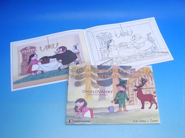 Dětské omalovánky s obrázky z večerníčku O hajném Robátkovi a jelenu Větrníkovi. Najdete zde 8 obrázků se známými hrdiny večerníčků České televize - hajný Robátko a jelen Větrník, pan Kotrč, medvěd Hromburác, divoké prase Karbous a další. Tyto omalovánky jsou jednoduché s velkými obrázky tudíž vhodné i pro ty nejmenší děti. Vybarvování obrázků pomůže rozvíjet řadu schopností a dovedností, zejména má velký vliv na jemnou motoriku ruky.