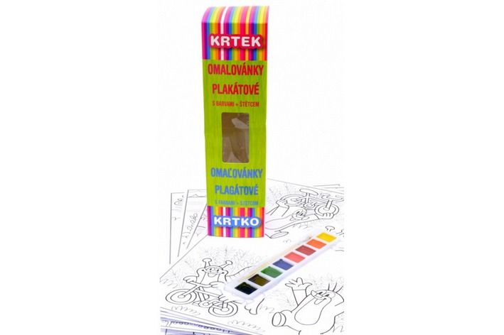 Plakátové omalovánky s barvami - Krtek 1. Krabička + 6 listů s perokresbami o velikosti A3 + 8 vodových barev + štětec.. K perokresbám barevné předlohy jsou umístěny na krabičce. Barevné předlohy k perokresbám jsou umíštěny na krabičce. Vnitřní listy, karton vyšší gramáže z důvodu použití různých výtvarných potřeb (pastelky, voskovky, vodovky, apod.)