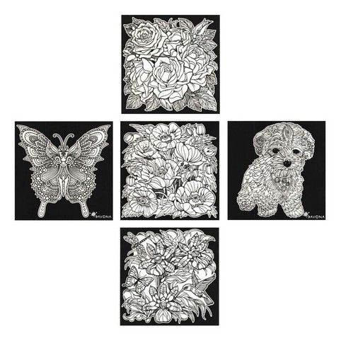 Omalovánky obsahují 5 listů s různými obrázky na bílém papíru. Pozadí obrázku a kontury mají černý sametový povrch. Pro vybarvení vnitřní části obrázků jsou vhodné fixy nebo pastelky.Papír gramáž 300g/m2