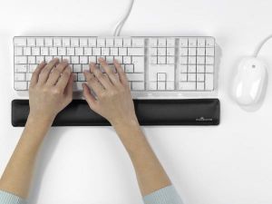 Opěrka zápěstí vyplněná gelem napomáhá ke snižování námahy zápěstí a nepohodlí při práci na PC.
