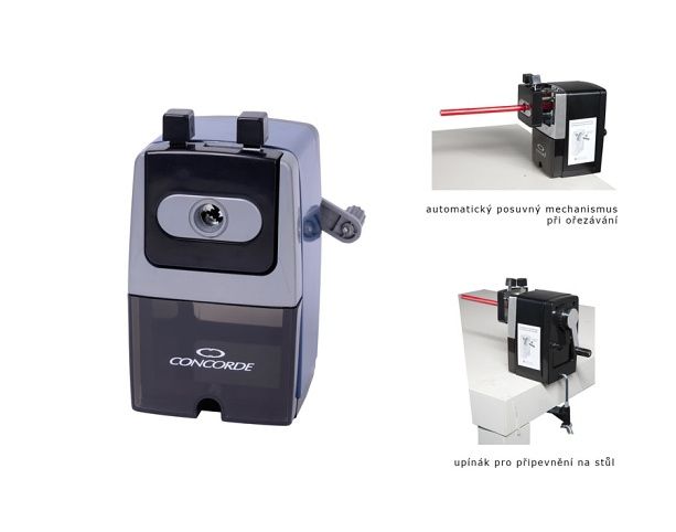 Ořezávací strojek s upevňovacím mechanismem na pracovní desku. Automatické posouvání tužky při ořezávání.