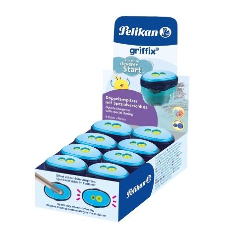 S bezpečným uzávěrem otvoru pro dřevěné tužky, pastelky Griffix, kvalitní nůž, stabilně stojící, průhledná nádoba, snadné zaklapnutí, 8 kusů s EAN štítkem na displeji