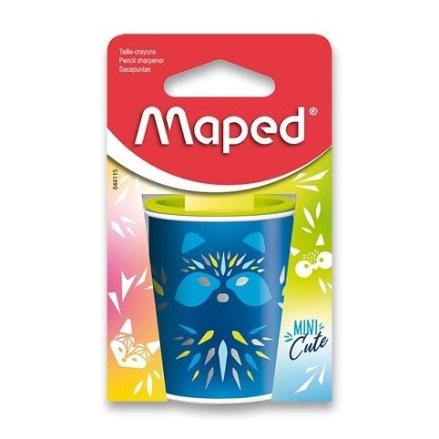 Kovové ořezávátko Maped Mini Cute se 2 otvory a odpadní nádobkou se zvířecími motivy a veselými barevnými kombinacemi. Ochranné, pevně uchycené uzavírání zabraňuje špinění, ideální do penálu. Součást nové designové kolekce Mini Cute.