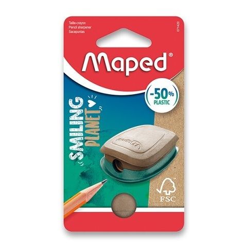 Plastové ořezávátkoMaped Smiling Planet s odpadní nádobkou. Je vyrobeno z 50% směsi dřevního vlákna s certifikací FSC a má recyklovatelný kartonový obal.