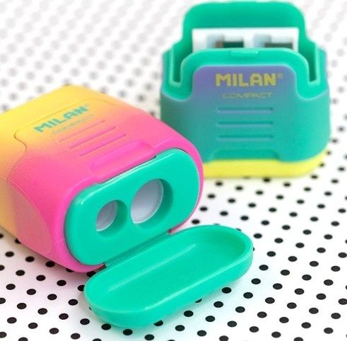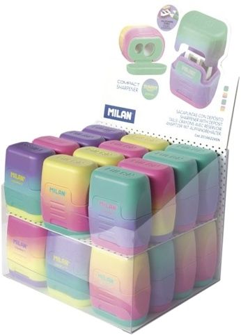 Dvojité ořezávátko (velikost standardní a MAXI) se zásobníkem. Ořezávátko má ostrou a odolnou ocelovou čepel, díky které je ideální pro všechny druhy tužek. Má také bezpečnostní systém čepele, který zabraňuje odtržení čepele od těla ořezávátka. 4 různé barvy: žlutá, fialová, růžová a zelená. Originální design vytvořený vlastním R+D oddělením MILAN.