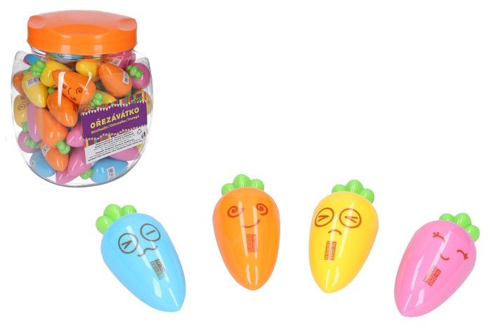 Ořezávátko na jednu tužku ve tvaru mrkve.