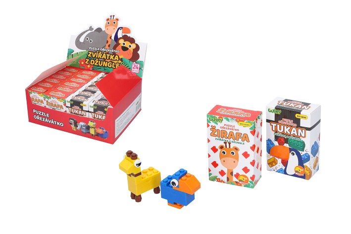 Ořezávátko na jednu tužku ve tvaru zvířátek - žirafa a tukan.