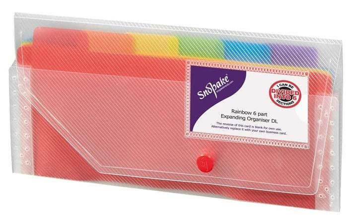 Organizér na dokumenty s 6-ti dílným organizérem Rainbow, s plastovými barevnými přihrádkami a lepicími štítky, kapsička vizitkového formátu na vnější straně, maximální kapacita 100 listů, Snopake garance 5 let, formát DL