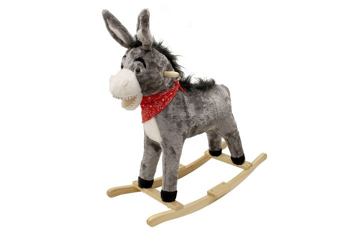 Osel houpací s efekty. Velikost 74 x 33 x 72 cm. Se zvukovými efekty. Aktivace stiskem tlačítka v uchu. Max zatížení: 50 Kg.