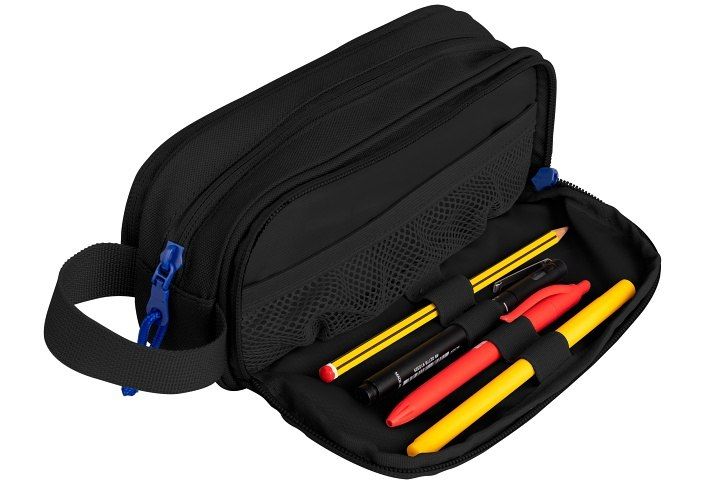 Polyester, 22 x 9,5 x 7 cm,2 uzavíratelné kapsy na zip. Zip s plným otevíráním. Vnitřní podšívka z textilní tkaniny sladěné s barvou penálu. Rukojeť pro snadnou přepravu. Recyklovaný materiál RPET.