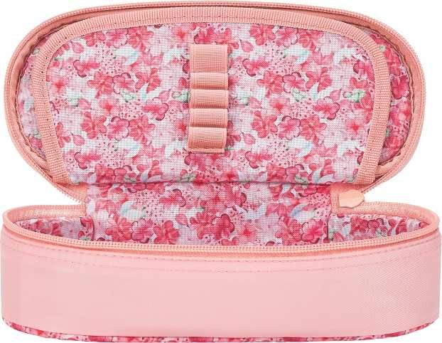 Voděodolná polyesterová tkanina, květinová podšívka uvnitř pouzdra. Klopa s integrovanou kapsou a poutky na pero. Hlavní kapsa na zip. 23,5 x 8,5 x 5 cm