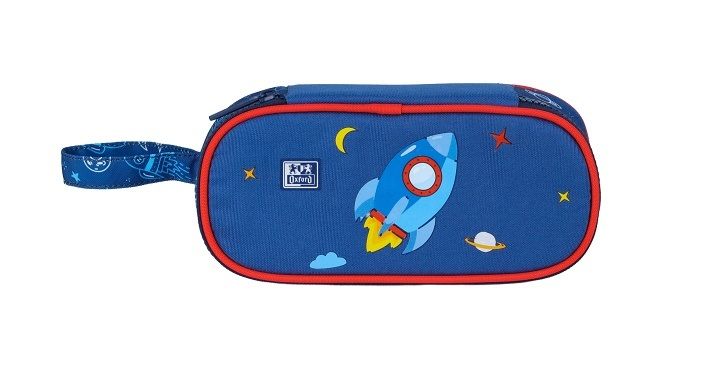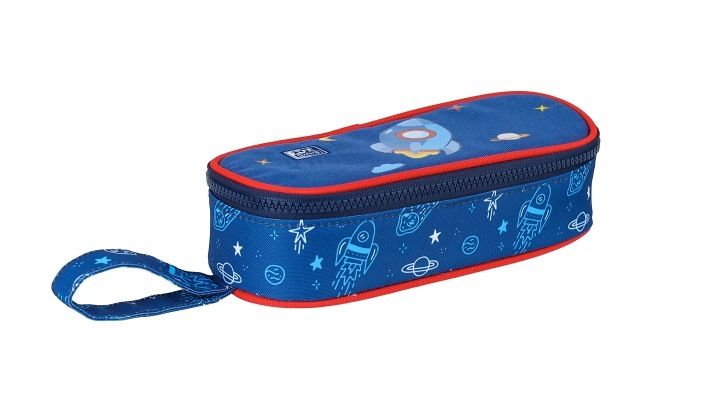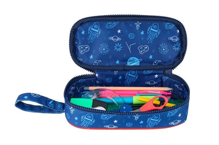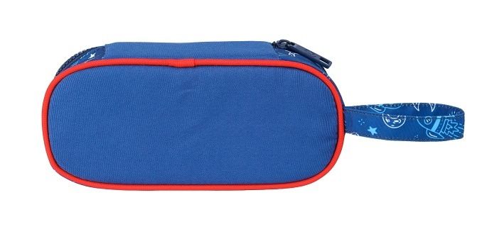 Penál s horní klopou, Rozměry 23,5 x 12 x 3,5 cm, Zip z recyklovaného polyesteru, Modrá. Kovové zapínání s modrou stuhou. Zip v barvě odpovídá penálu.