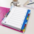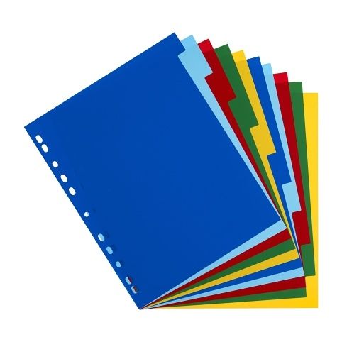 Vyrobeno z barevného, pevného a pružného PP. Univerzální perforace, 10 distančních vložek 2x tmavě a světle modrá, červená, zelená a žlutá