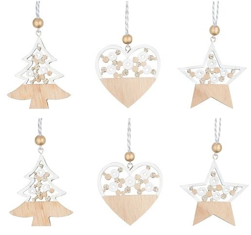 Ozdoba dřevěná na zavěšení se zlatými glitry 6 cm, 6 ks