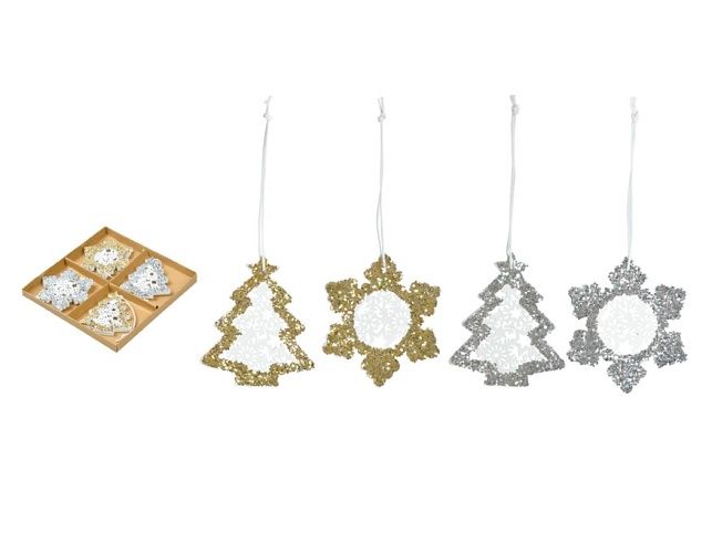 Ozdoby dřevěné bílé s glitrem 4ks/7,5cm mix