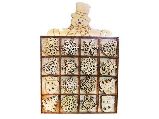Vánoční dřevěné ozdoby 48 ks - Vánoce jsou svátky pohody a klidu, a proto je potřeba se na ně pořádně připravit. Vyzdobte si domov touto krásnou dřevěnou dekorací, která Vám navodí pocit přicházejících Vánoc. Každá vánoční ozdoba je opatřena provázkem na zavěšení. Můžete použít na ozdobení vánočního stromečku, zavěsit na dveře, okno a zkrášlit tak Vaše bydlení. SET OBSAHUJE: - 48 ks ozdob (sněhulák, vločky, stromeček) Uvedená cena je za 1 balení.