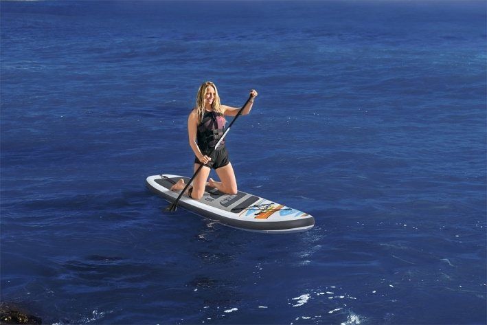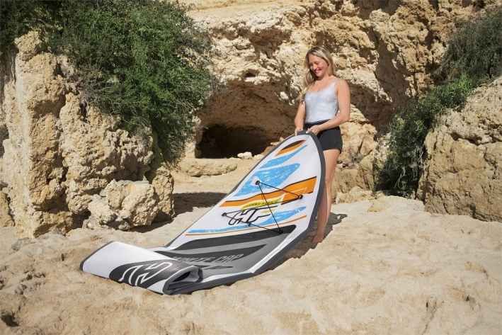 Materiál se zapuštěnými švy. Přenosný, skladný a vyznačuje se pevností srovnatelnou s pevnými prkny. Protiskluzová úprava vrchní plochy. Praktická rukojeť na horní straně pro přenášení prkna. Elastické lanko pro upevnění zavazadla. Nastavitelné pádlo 2,17 m. Počet osob: 1 dospělá osoba. Nosnost: 120 kg. Rozměr: 3,05 m x 84 cm x 12 cm. Obsahuje: 1 paddle board, 1 pádlo, 1 ruční pumpa, 1 cestovní taška, 1 elastické lanko, 1 středová ploutev, sada pro opravy.