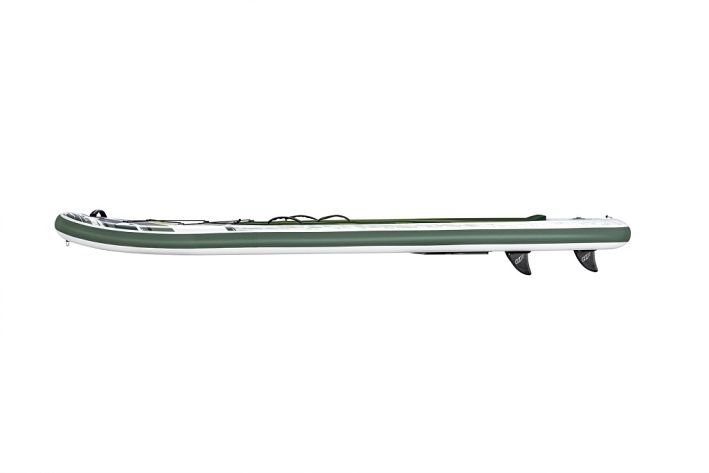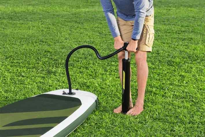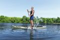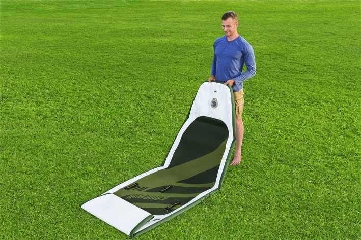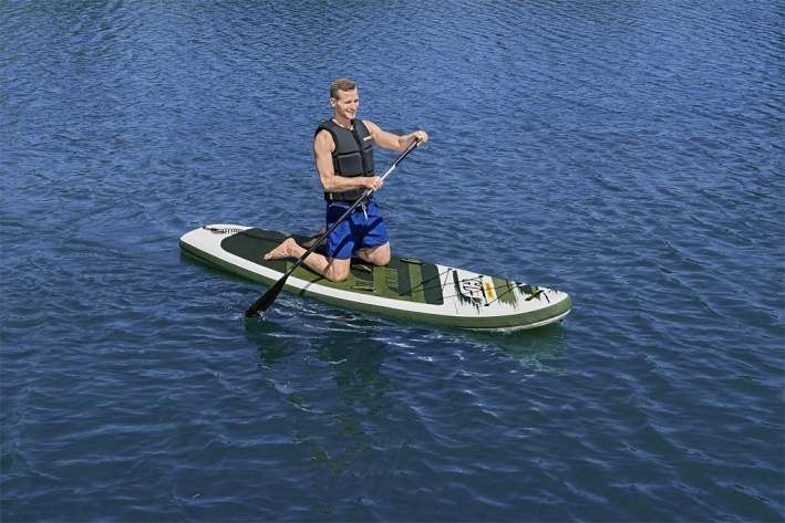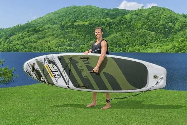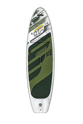 Paddleboard je vyroben z materiálu Tri-Tech & drop steh, který poskytuje bezkonkurenční pevnost, stabilitu a odolnost. Nafukovací deska má protiskluzovou trakční vložku, která zajišťuje pevný a stabilní podklad pro zajištění pohodlí a stálosti pro každého jezdce. Více pohodlných úchytů pro snadné přenášení do vody a zachycení při použití na řece. Užitečná cestovní taška usnadňuje transport příslušenství a deska je velmi snadno nafouknutá pomocí ruční pumpy. Elastická šňůrka bezpečně zajistí další věci na desce. Rozměr: 310 cm x 86 cm x 15cm.