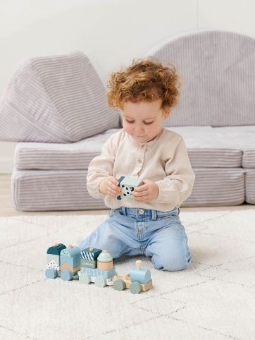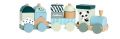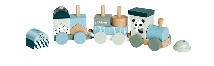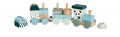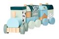 Dřevěný vláček s 2 vagónky a 13 kostičkami různých tvarů. Délka 29 cm. Materiál bříza.