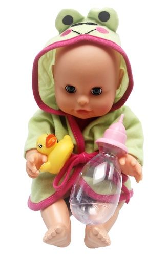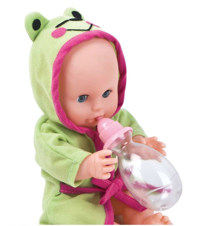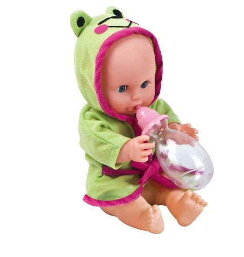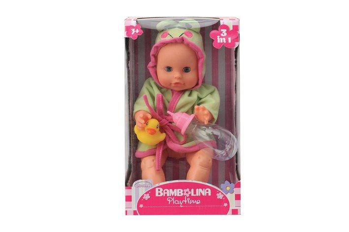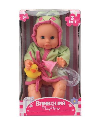 Panenka Bambolina, tentokrát jako miminko v zeleném župánku, je připravena na lékařskou prohlídku. Holčičky mohou panenku vyslécii a vykoupat společně s malou kachničkou. Aby mohly miminko po prodhlídce utišit a uspat, je příhodné mít připravenou i lahvičku s mlékem. Panenka je mrkací. Panenka je velikosti 30 cm.