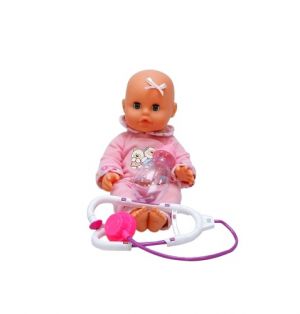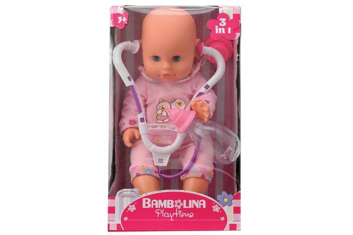 Panenka Bambolina o velikosti 33 cm se stetoskopem a kojeneckou lahvičkou.