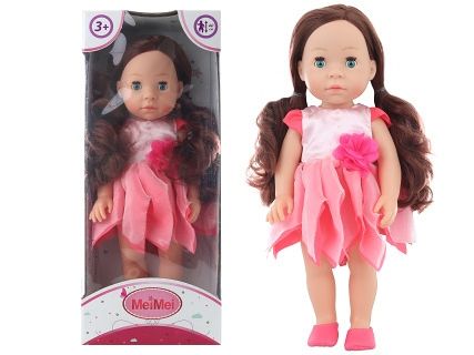 Panenka s dlouhými vlásky oblečená do růžových šatů a botiček. Oblečení lze sundat, je na suchý zip. Panenka má tvrdé plastové tělíčko a mrkací oči. Rozměry panenky cca 40 x 16 x 7 cm. Rozměry balení cca 18 x 42 x 11 cm. Věk 3+
