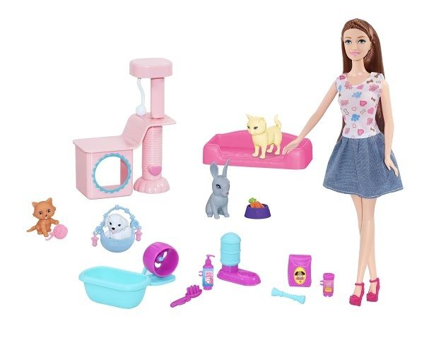 Panenka chovatelka. Velikost panenky 30cm. obsahuje: panenku, 2 kočky, pejska, králíka, příslušenství pro zvířátka včetně škrabadla a pelíšku.