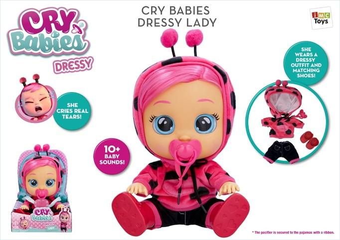 Poznejte zcela novou řadu plačících panenek Cry Babies DRESSY. Máji vlasy s kořínky, třpytivé oči a nosí roztomilý trendy outfit! Když jí sundáte dudlík, pláče opravdové slzy! Dejte jí paci zpět do pusy nebo ji položte, aby přestala plakat. Vydávají 11 realistických dětských zvuků! Cry Babies DRESSY přichází s proměnlivým rozkošným oblečením, párem odnímatelných botiček a odpovídajícím dudlíkem. Dokonalá plačící panenka pro zábavné a nápadité hraní. Doporučený věk 18 měsíců a více. Na baterie: 2x AAA (jsou součástí balení)