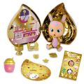 Nová série panenek Cry Babies Magic Tears, zlatá edice. Domečky ve tvaru zlaté slzy a v nich originální panenky se zlatými doplňky, 6 různých panenek ke sbírce. Panenka má v hlavě otvor, kterým nalejte do hlavičky vodu, můžete vodu také doplnit pomocí lahvičky a panenku napojit. Po stisknutí bříška panenka roní opravdové zlaté slzy. Barevnost slz je omezená do vyčerpání zabarvovací tablety umístěné v hlavě panenky. Po otevření domečku doplňky jsou skryté – otevřením jednotlivých boxiků zjistíte co má tentokrát panenka s sebou.